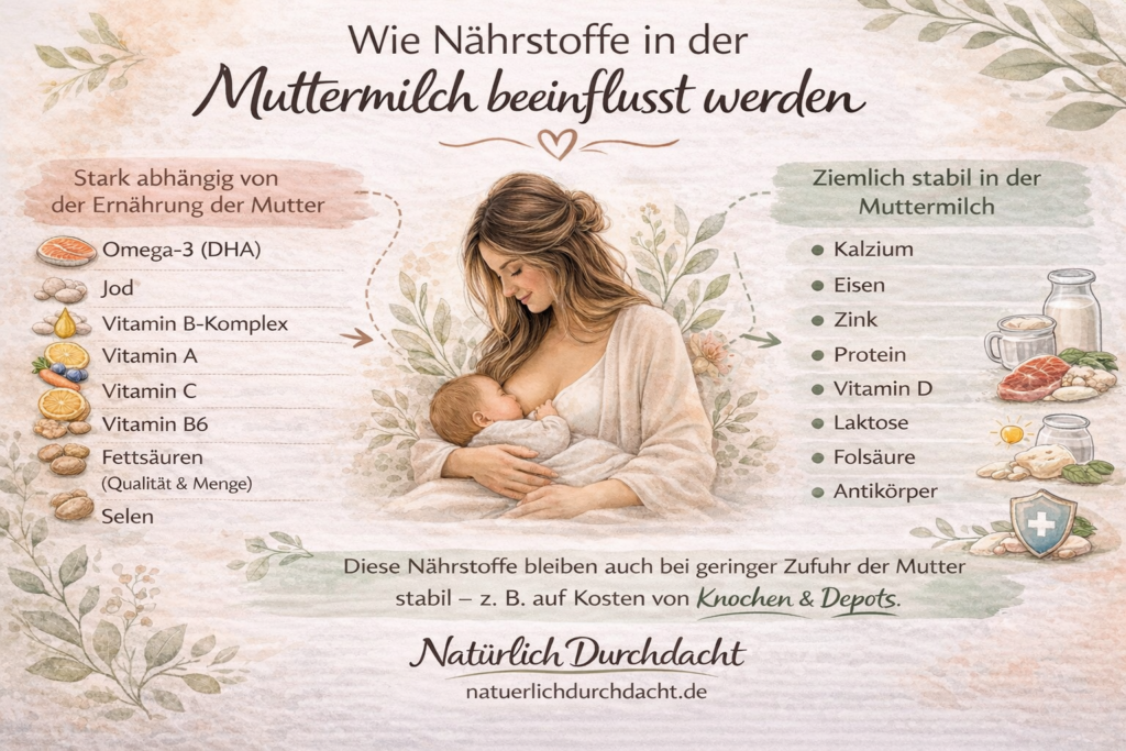Der weibliche Körper schützt das Baby erstaunlich gut. Viele Bestandteile der Muttermilch bleiben relativ stabil – selbst dann, wenn die Ernährung der Mutter nicht optimal ist. Der Körper greift dabei auf eigene Speicher zurück. Beispiele sind unter anderem Calcium aus Knochen oder bestimmte Fettsäuren aus Depots.